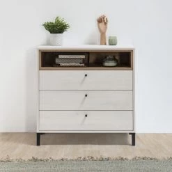 HOMN Commodes Et Cabinets Commode 3 Tiroirs Et 1 Niche, Couleur Blanc Et Bois, 80 Cm Longueur