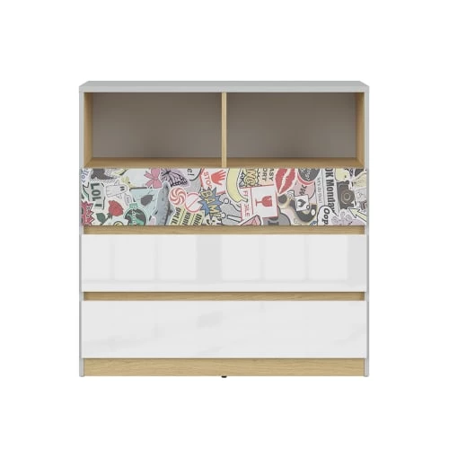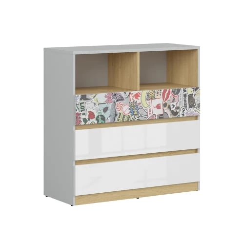 Brw Commodes Et Cabinets Commode 3 Tiroirs 2 Niches Gris Blanc Et Sticker