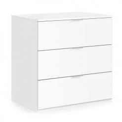 Commode à trois tiroirs entièrement en blanc. Simple et essentielle, cette commode remplit une fonction pratique et fonctionnelle grâce à la capacité des trois tiroirs et de l’étagère supérieure où vous pourrez confortablement déposer vos bibelots. Les deux tiroirs sont équipés de trois poignées en aluminium fines et élégantes. Grâce à sa conception simple, il convient à tout type d’environnement. Fabriqué entièrement en stratifié, il résiste aux chocs et aux rayures et est durable dans le temps. Mesure 77 x 80 x 38 cm.