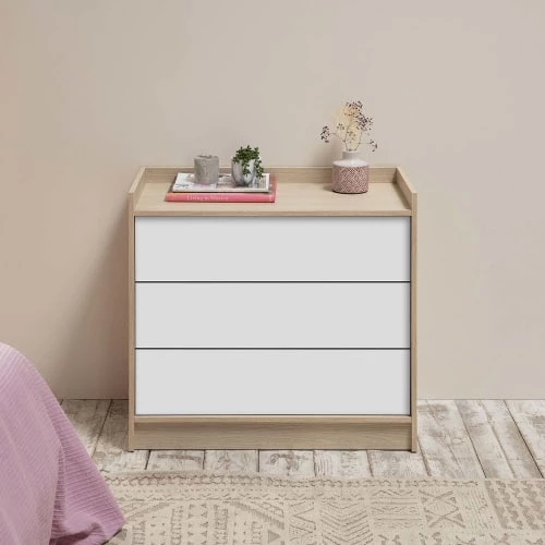 ·3 tiroirs finition chêne, blanc ou gris avec glissières métalliques pour une meilleure ouverture.