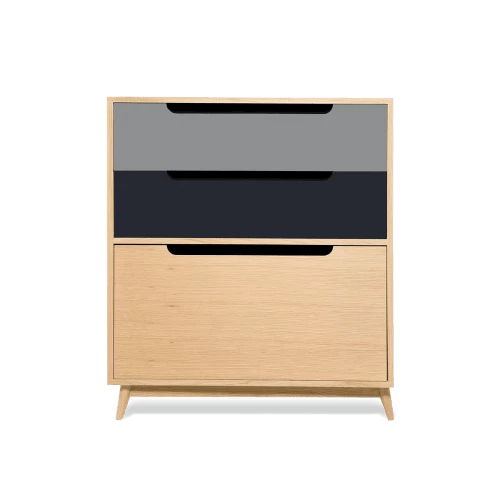 La commode MOKA dispose de 3 tiroirs à fermeture lente et leur ouverture est poncée en oblique à la main. Le design est sobre et élégant pour s’adapter à tous les styles de déco.