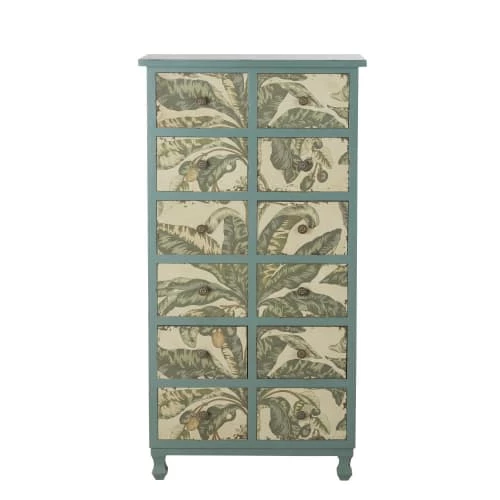 Tiroirs (x12) : panneaux de fibres de moyenne densité, vernis nitrocellulosique coloris vert, finition mate et façade recouverte de papier décoratif impression feuilles de bananier, finition vernis nitrocellulosique transparent mat