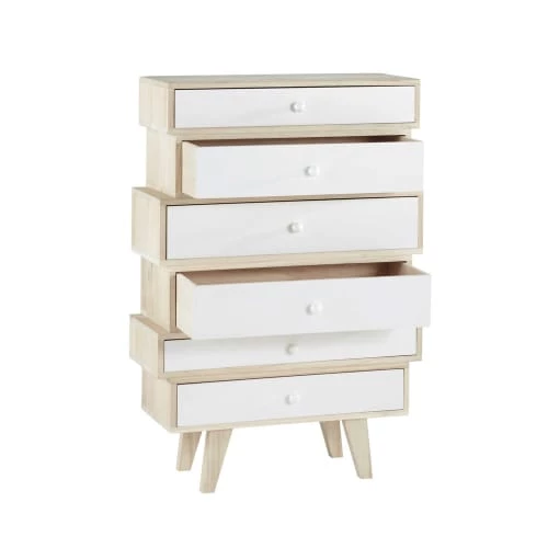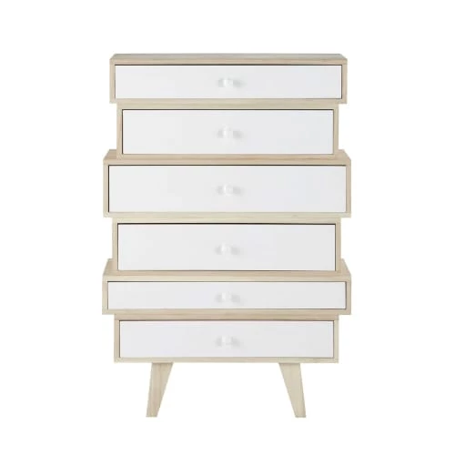 A la recherche d’un meuble de rangement original ? Avec son design irrégulier, le semainier style scandinave 6 tiroirs en paulownia blanc SPRING vous comblera ! Moderne ou rétro ? Vous n’aurez plus à choisir : son look sobre et épuré trouvera sa place quelque soit le style de votre intérieur ! Dans la chambre ou dans l’entrée, ce meuble de rangement offre un bel espace pour accueillir toutes vos affaires ! Parfait pour donner un côté décalé en toute sobriété !