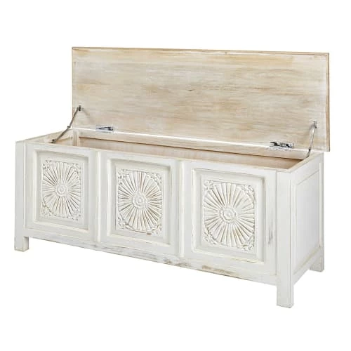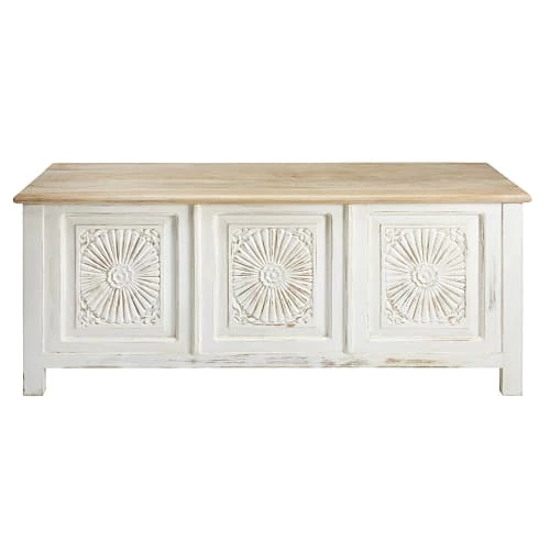 Partez à l’autre bout du monde, avec ce coffre sculpté en manguier massif blanc vieilli SHIVA à l’esprit authentique. Conçu en manguier, soigneusement vieilli et légèrement blanchi, ce joli coffre de rangement fera naître une ambiance douce et exotique. Avec sa façade finement sculptée à la main, chaque coffre est une pièce unique. Pour plus de rangements, optez pour une commode.