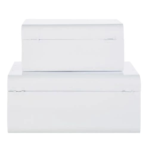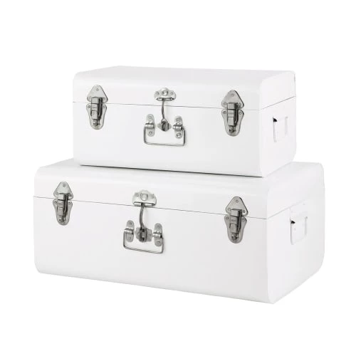 En métal blanc, ces 2 malles au style très moderne seront idéales comme malles de rangement ou comme objet déco, directement posées au sol ou sur une grande commode contemporaine.