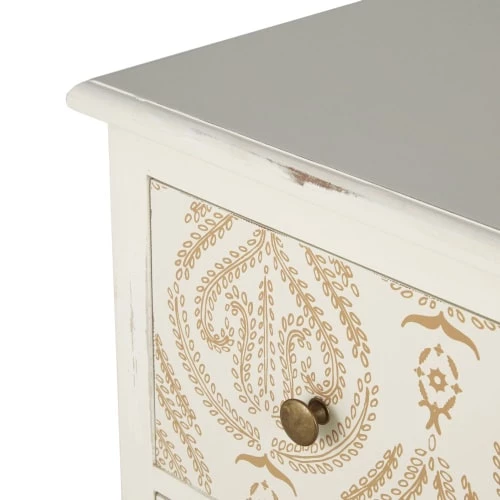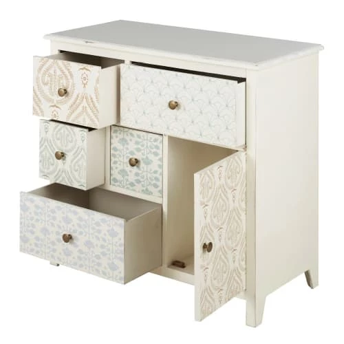 5 tiroirs/1 porte : vernis nitrocellulosique blanc et motifs sérigraphiés colorés sur les façades
