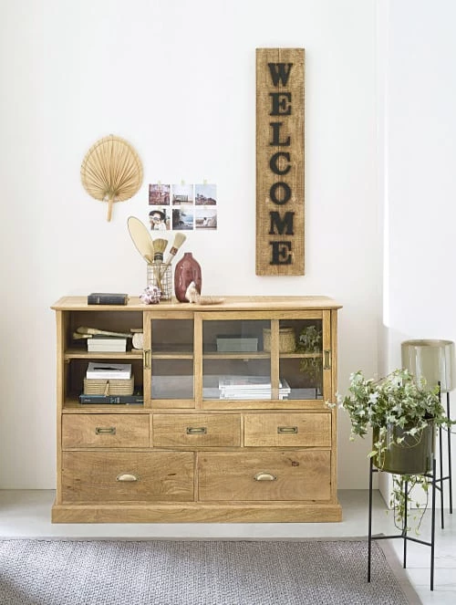 Plongez votre intérieur dans une ambiance maison de campagne chaleureuse avec le cabinet de rangement 2 portes en verre et 5 tiroirs CEZANNE. Mêlant habilement verre trempé et bois recyclé, ce meuble de rangement joue la carte de l’authenticité. Il sera parfait dans un salon ou une salle à manger pour mettre en valeur votre plus belle vaisselle et ranger vos couverts, torchons, sous-verres et sets de table. On l’imagine aux côtés d’un canapé moelleux et d’une table basse en bois. Agrémentez ce cabinet de rangement d’une lampe en bois sculpté à l’abat-jour clair et d’un vase en verre orné de fleurs séchées pour une atmosphère douce et cosy. On adore !