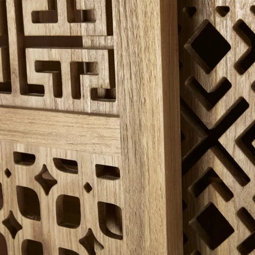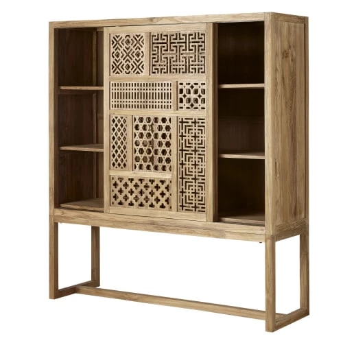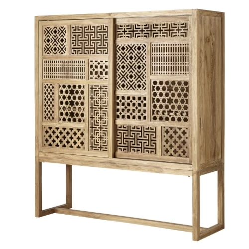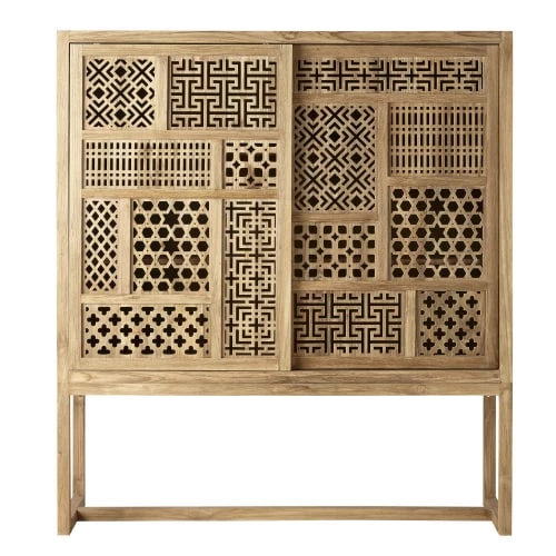 Succomberez-vous à l’exotisme du cabinet de rangement ajouré 2 portes en teck KASBAH ? Ses lignes droites s’associent à des motifs ajourés qui lui confèrent tout son charme. En teck, ce meuble de rangement saura apporter une touche d’authenticité à votre intérieur. Ses 4 étagères amovibles vous permettront de ranger vos trésors. Du style, de l’originalité, quoi de plus pour vous séduire ?