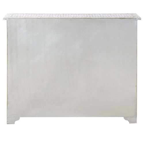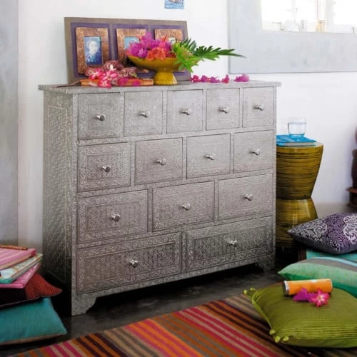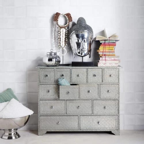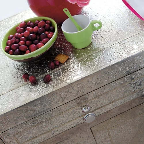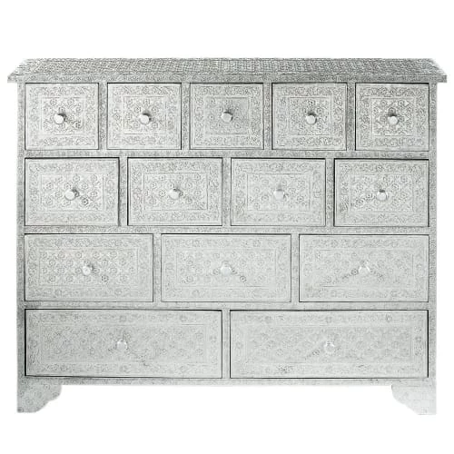 Finition : partie extérieure recouverte d’une feuille de metal ciselée à la main, coloris argenté et patinée