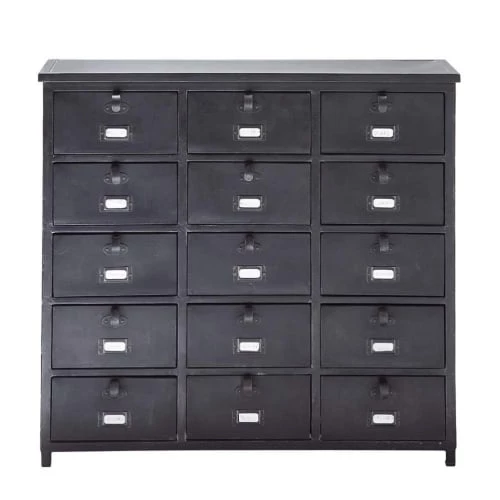 Le cabinet fer noir EDISON, avec ses 15 tiroirs dotés de poignées et porte-étiquettes, saura vite se rendre indispensable pour le rangement de votre bureau. Inspiré du design industriel, ce meuble de bureau en fer noir effet vieilli modernisera votre intérieur.