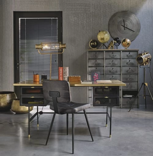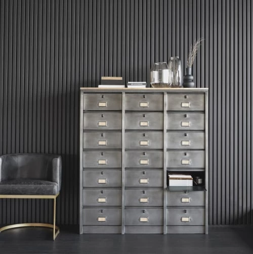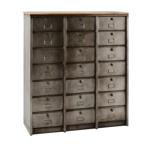 Structure et façades casiers : métal, peinture nitrocellulosique, coloris gris, aspect veilli Intérieur casiers : métal, peinture nitrocellulosique, coloris noir mat Plateau du dessus : manguier massif, vernis nitrocellulosique