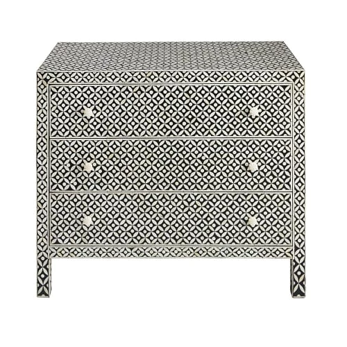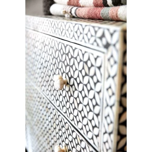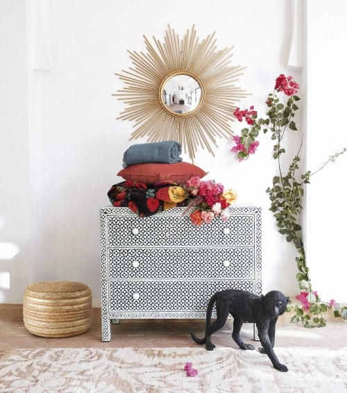 Dans une chambre contemporaine, choisissez d’y ajouter une touche d’ethnique chic avec la commode en manguier et marqueterie d’os BAIKAL . Dans un intérieur épuré, elle vous fera doucement voyager.