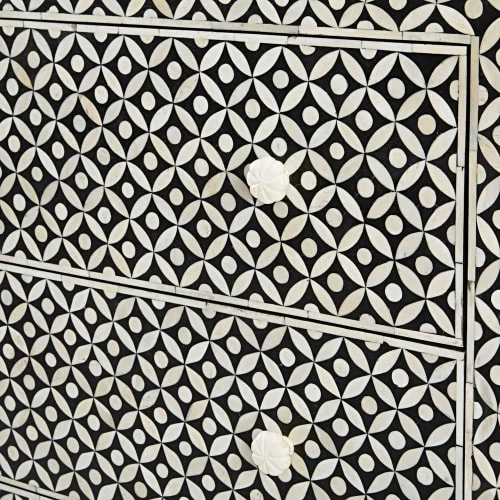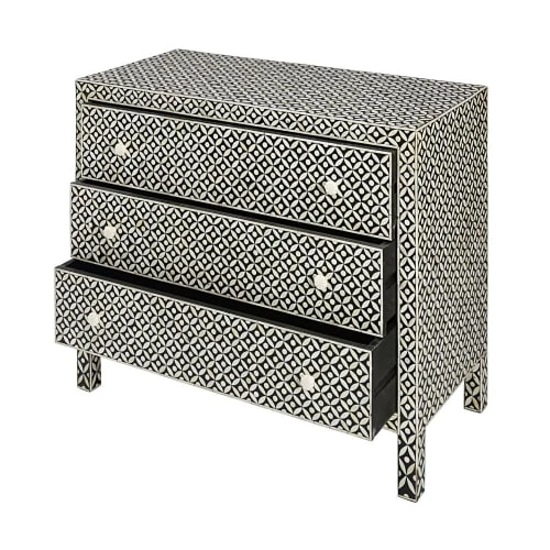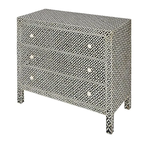 Cette commode est réalisée dans du bois de manguier recouvert de marqueterie d’os.
