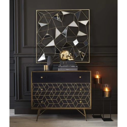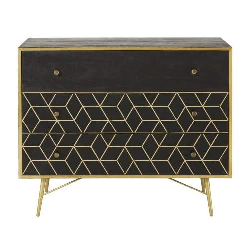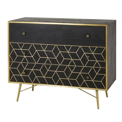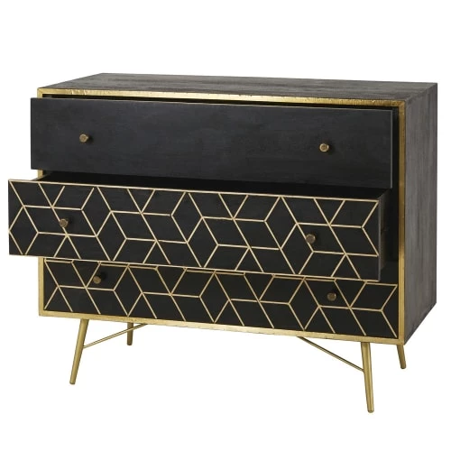 Structure, tiroirs (3) : manguier massif, teinté noir, vernis nitrocellulosique Panneau de fond : panneaux de fibres de moyenne densité (E1) Inserts, pieds, poignées : métal, coloris laiton, aspect patiné