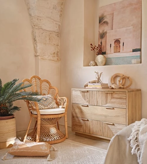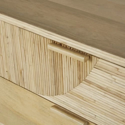 Façade des tiroirs : marqueterie de rotin finition vernis nitrocellulosique mat apposée sur un panneau de fibres de moyenne densité (E1)