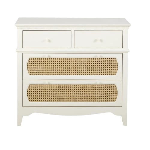 4 tiroirs : 2 avec façades en panneaux de fibres de moyenne densité (E1), peinture acrylique coloris blanc cassé, finition mate et 2 avec façades en rotin tressé, finition vernis acrylique transparent