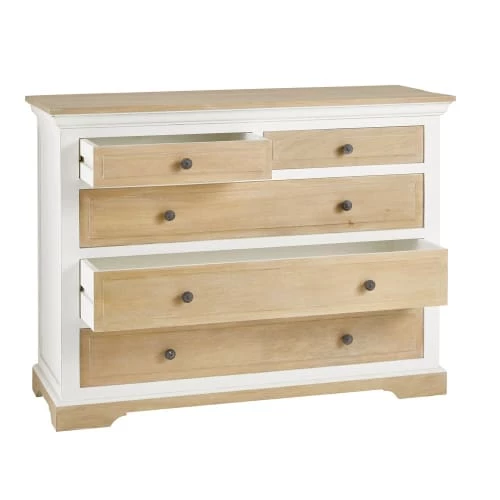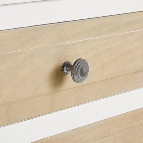 Façade des tiroirs, base et plateau : manguier massif finition légèrement blanchie peinture organique coloris blanc