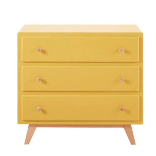 Inspirée des lignes vintage, la commode compatible plan à langer 3 tiroirs jaune SWEET 2 apportera du peps à la déco de chambre de votre enfant. Elle vous permettra pendant les premiers mois de bébé, de fixer le plan à langer de la même gamme. Ce plan amovible vendu séparément se substituera à une table à langer et offrira un vrai gain de place dans la chambre. Quand bébé sera suffisamment grand, il vous suffira de retirer le plan à langer pour faire de ce meuble une commodeà part entière. Elle pourra également servir de support pour les objets déco de votre choix : veilleuse, lampe, jouets. Conçue pour un usage durable dans le temps, elle verra votre enfant évalué au fil des années. On met sur l’intemporel jusqu’au bout !