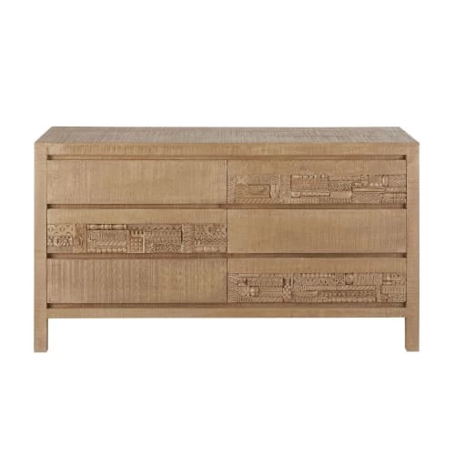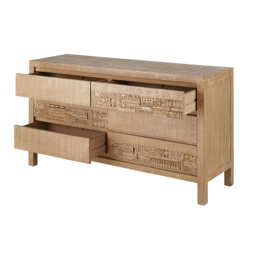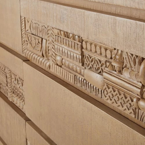 Façade des tiroirs : patchwork de pièces de manguier massif sculptés à la main