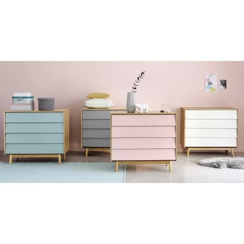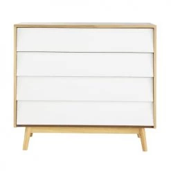 Sobre et épurée, la commode vintage 4 tiroirs blanche FJORD mêle le bois clair au blanc pour un effet très rafraîchissant. Pratique pour les petits espaces, elle vous offre un beau volume de rangement avec ses 4 tiroirs. Clin d’œil au design des années 50, ce meuble de rangement est monté sur des pieds obliques. Une belle promesse !