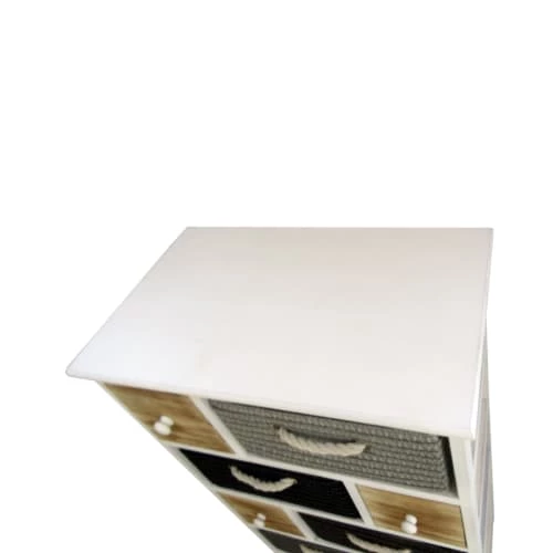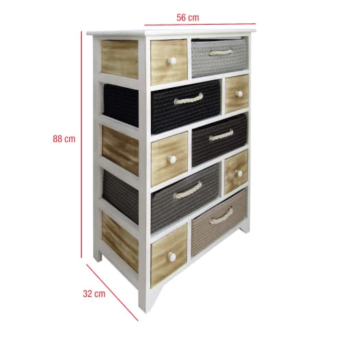 o Dimensions: H 88 x L 56 x P 32 cm o Dimensions des tiroirs: H 14 x L 14,5 x P 28 cm o Dimensions des paniers: H 14 x L 32 x P 17 cm o Couleur: Blanc, Marron, Gris