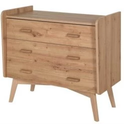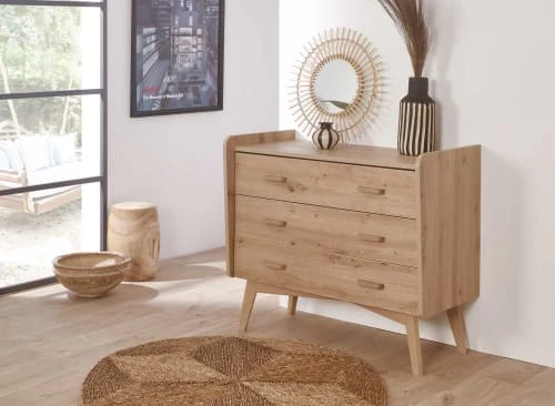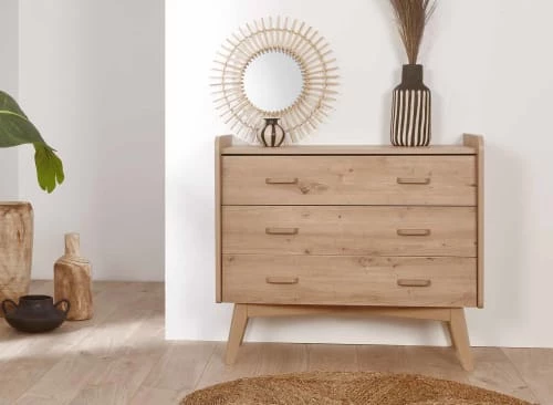 Avec ces pieds en bois massif et ces lignes droites et graphiques, cette commode aux inspirations vintage sera idéale. De par sa simplicité de style, cette commode en bois originale trouvera toute sa place et son utilité dans la chambre.