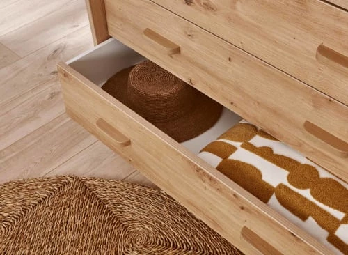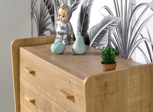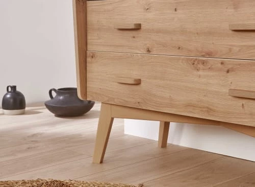 Un design simple et épuré mettant en avant le chêne vintage du meuble, fabriqué en France de manière écoresponsable et éthique. Cette commode se compose de panneaux de bois plaqués en chêne vintage et des pieds en bois de hêtre massif pour encore plus de stabilité. Les panneaux de bois qui compose cette commode sont écologiques et à très faible taux de formaldéhyde. Le vernis qui est utilisé pour les pieds du meuble est sans solvant et donc sans danger pour la santé.