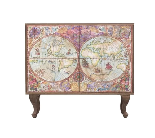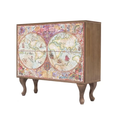 Meuble auxiliaire de 2 modules avec imprimés 360 avec différents designs, portes avec charnières clip cam intégrées avec fermeture douce. Poignées métalliques de zamak.