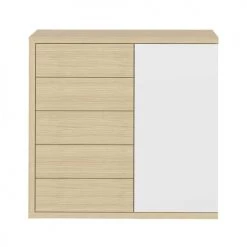 Cette version de la commode HUGO conserve l’esthétique et la délicatesse de la collection tout en proposant des rangements supplémentaires, dissimulés derrière sa porte blanche ou anthracite. Sa finition en chêne clair, très illuminée, mettra en valeur toutes les couleurs de votre pièce pour un intérieur contemporain et élégant.